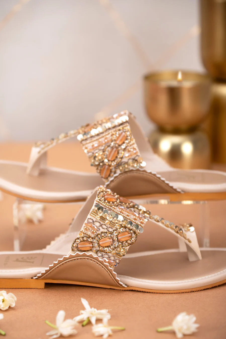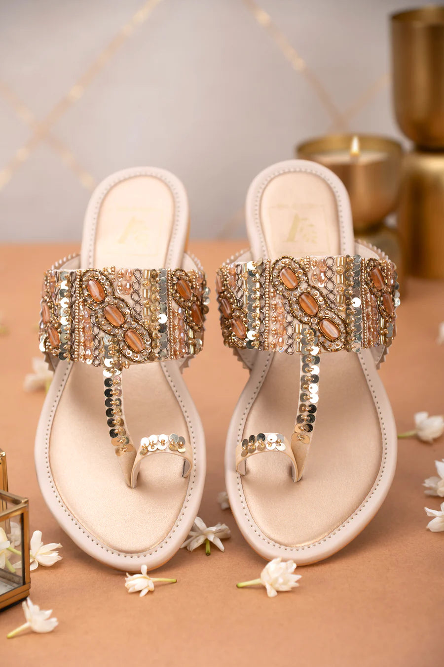 Step out in style with these glamorous Glided Glare Kolhapuri flats! Embroidered with shiny gold thread and finished with a dazzling array of golden beads, these beauties will be sure to have all eyes on you. Look and feel your best - you deserve it!